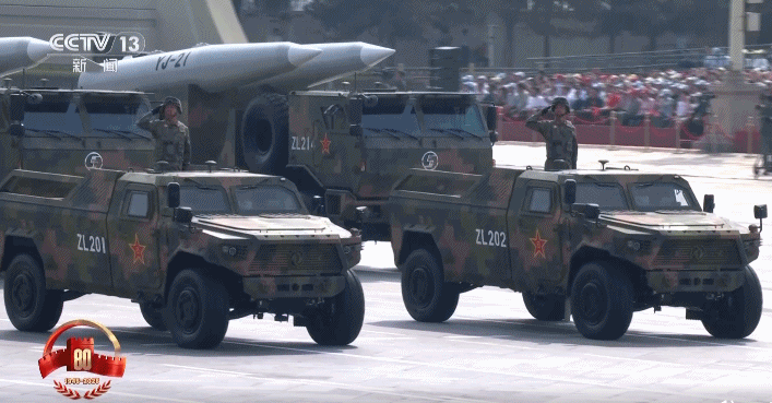 计谋冲击群的第二个方队是崇高高贵声速导弹方队,受阅的鹰击-21、春风-17、春风-26D导弹以结合编组模式通过,向展现大国长剑的锐利刀锋。